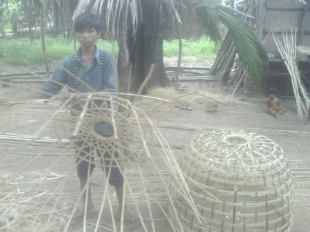 Mr. Heam Chanseng makes bamboo chicken coops to sell from his house while his wife is a farmer. They have four children and live in Run Choeung Village, Siem Reap Province, Cambodia. All of their children are young and in school.